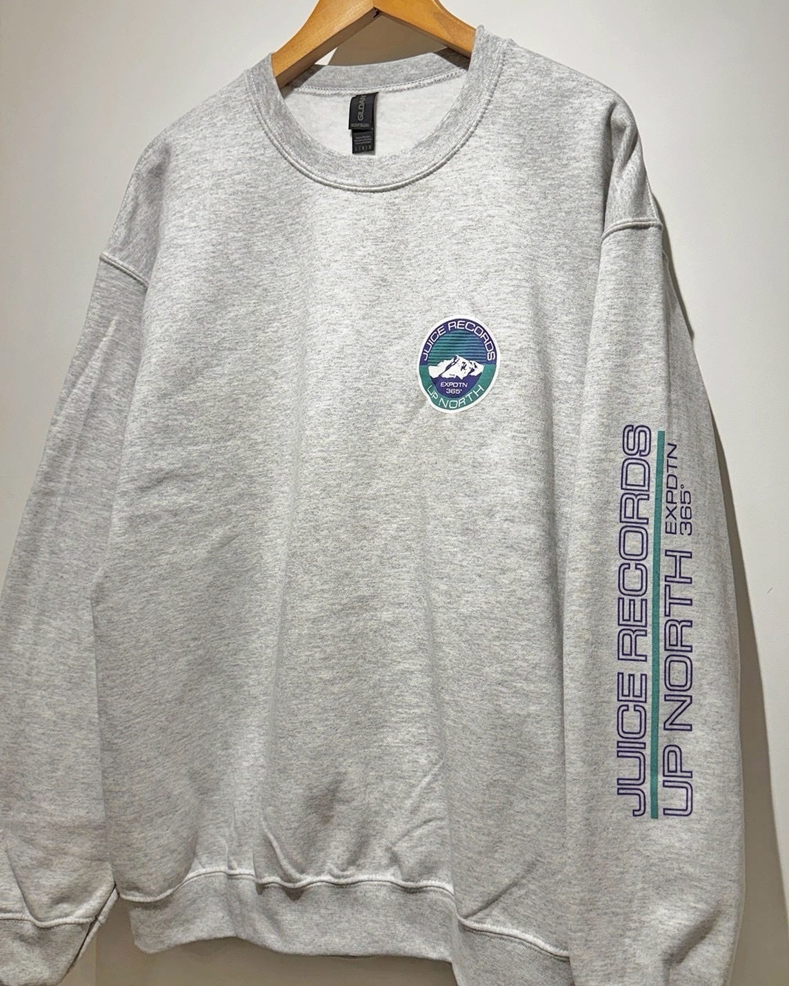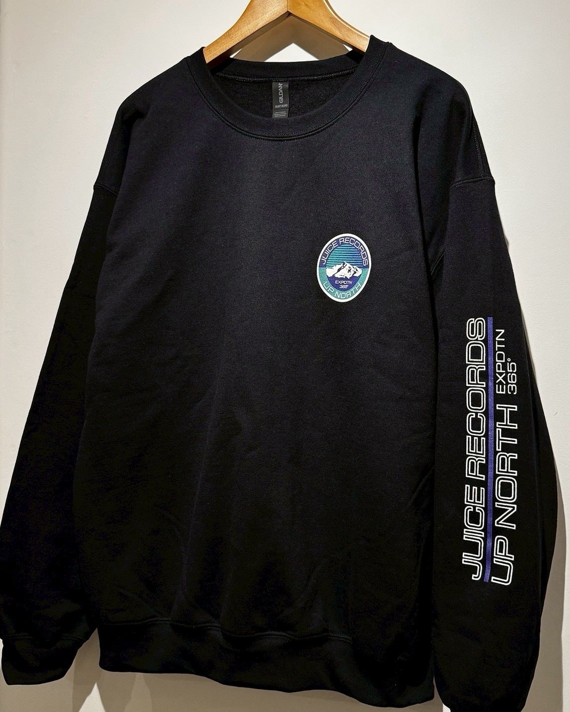 JUICErecordsとUP NORTH(アップノース)のコラボレーションアイテムです。2019年にも一度リリースしたシリーズで、今回は前回のラインナップになかったクルースウェットを作りました。